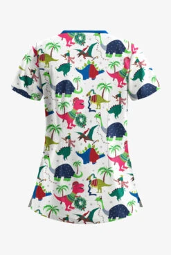 Butter-Soft Christmas Dinos Women’s 3-Pocket Criss Cross Print Scrub Top