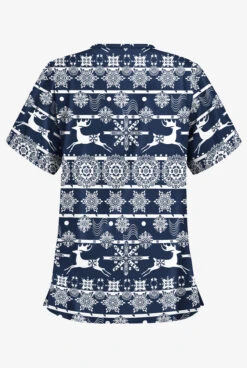 Butter-Soft Nordic Winter Navy Women’s 2-Pocket Relaxed Fit V-Neck Print Scrub Top