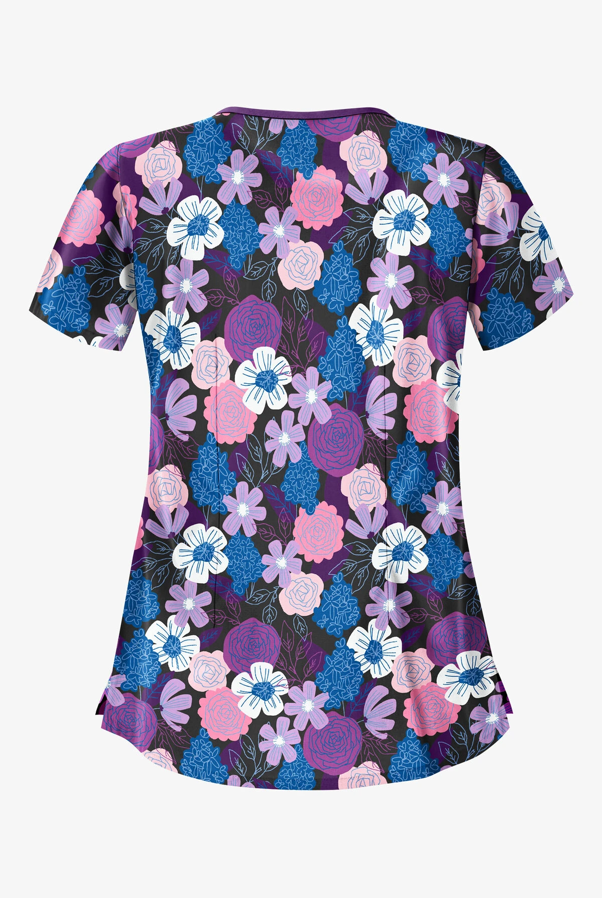 A new slant on the scrub top—our 4-pocket style has a modern, asymmetrical neckline that adds elegance and is super-flattering. The print is a funky graphic floral in shades of pink, blue and purple.