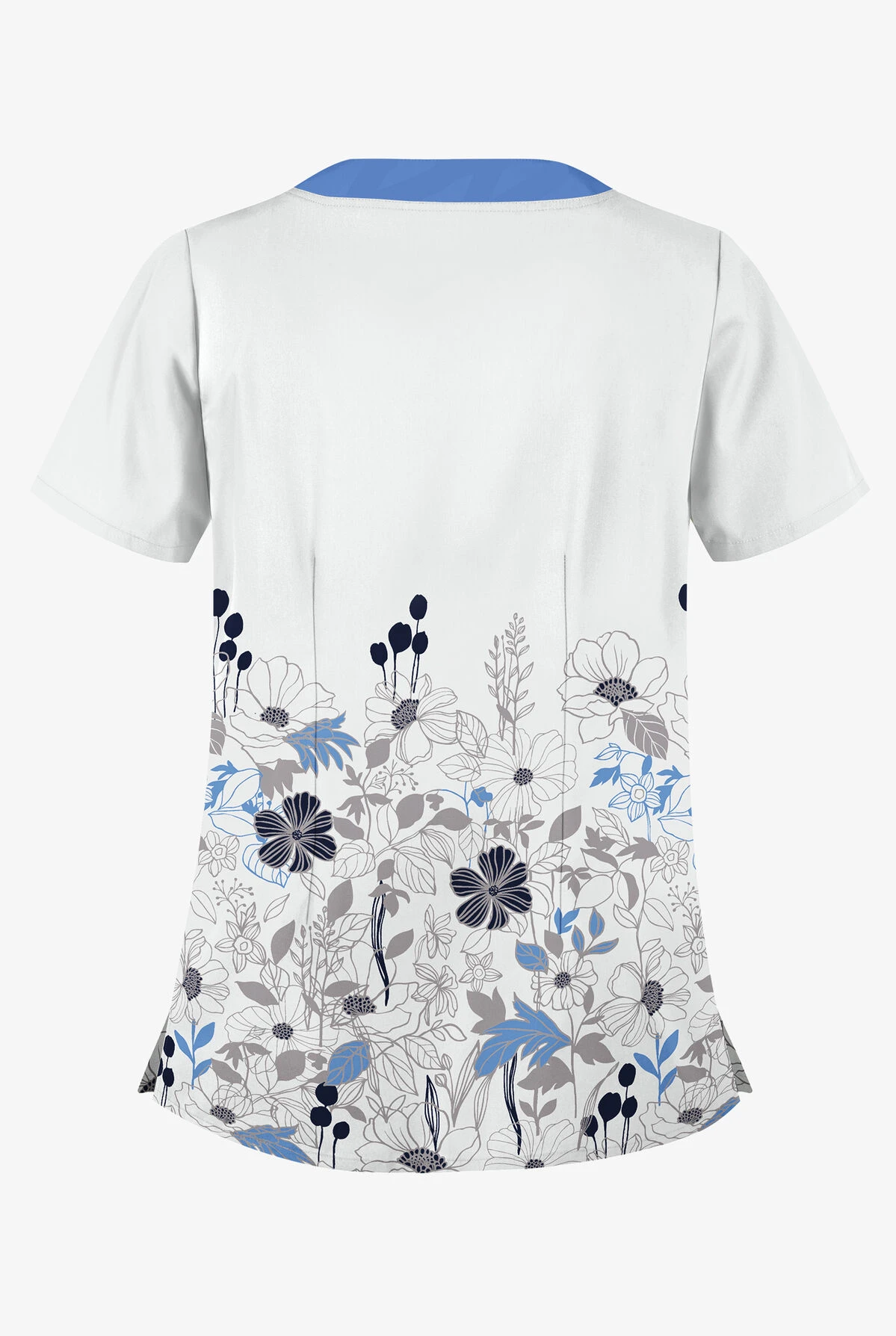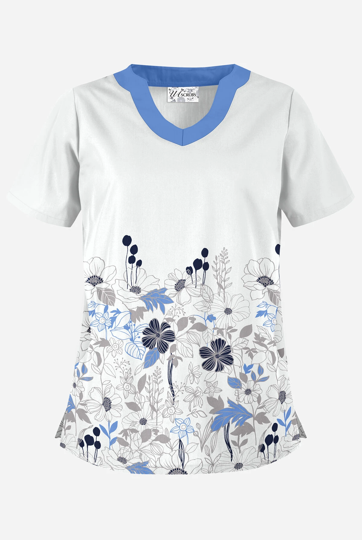 Our Butter-Soft Floral Field White Printed Women’s 2-Pocket Scallop Neck Scrub Top will be a pleasing addition to your print scrubs collection. We’ve added two side seam pockets for storage as well as two back darts and side slits for a more flattering fit. This fashion scrub top is accented with a solid berry burst trim along the neckline. The print fabric is 55/45 Cotton/Poly.