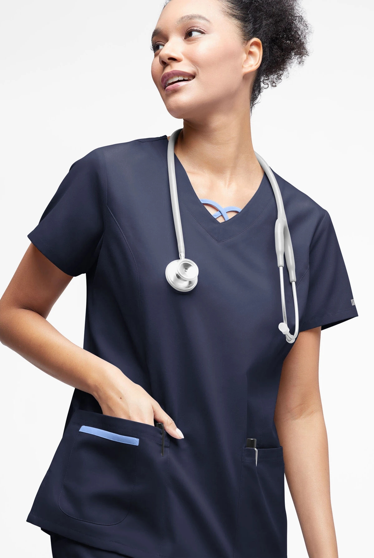 - Curved V-neck with contrast crisscross detail