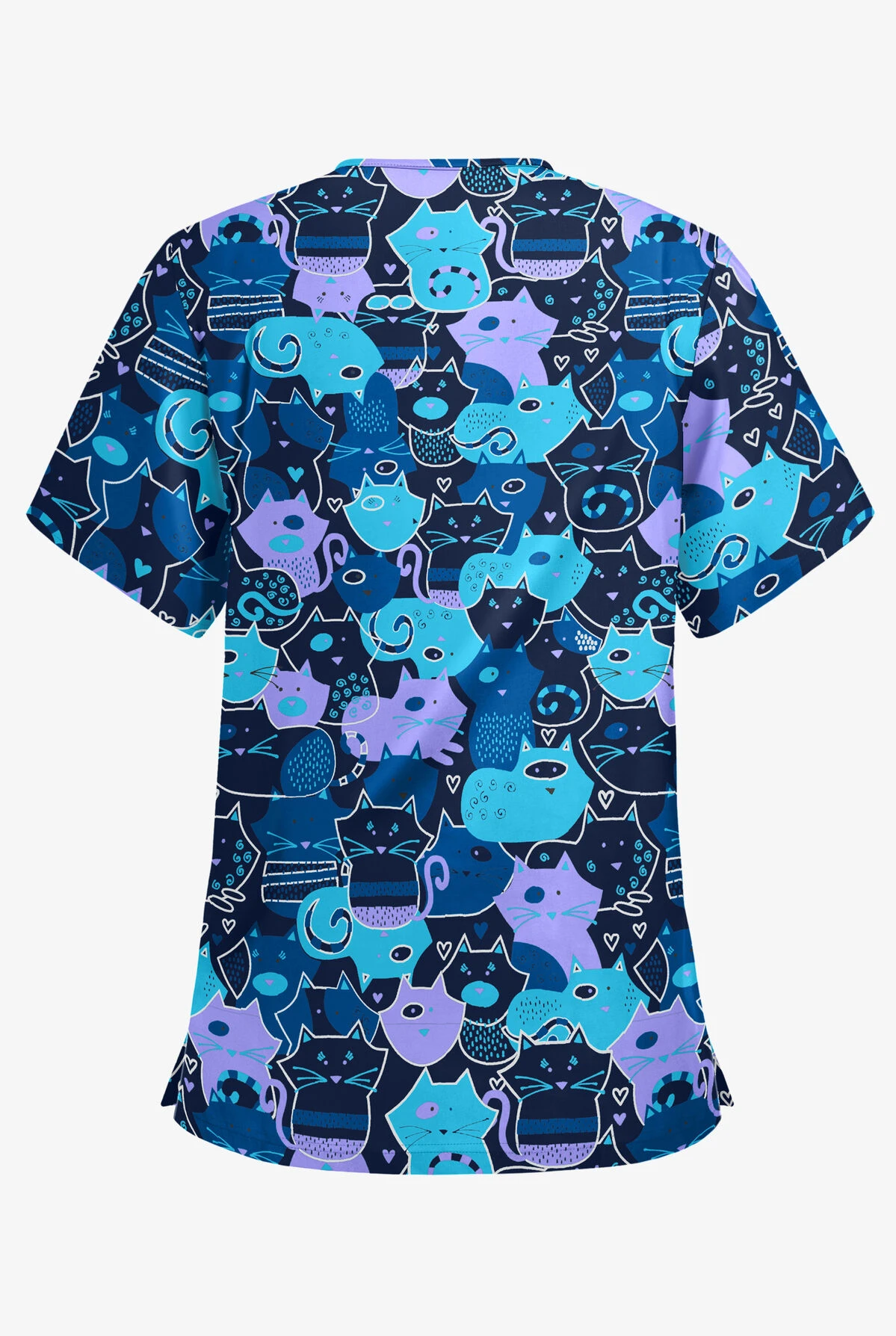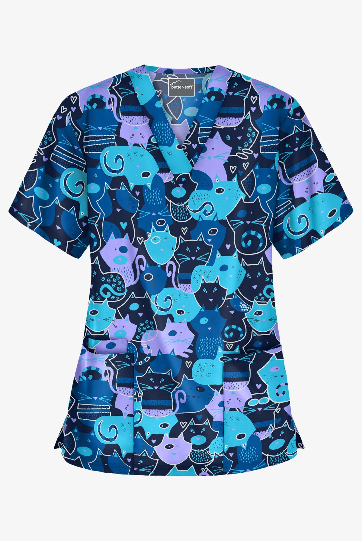 Looking for a scrub top with a little extra breathing room? Designed with a relaxed fit in a classic V-neck shape, our three-pocket top is the one. Look closely at this puzzle – all the pieces are cats! How fun is that? Super cute in all those blues.