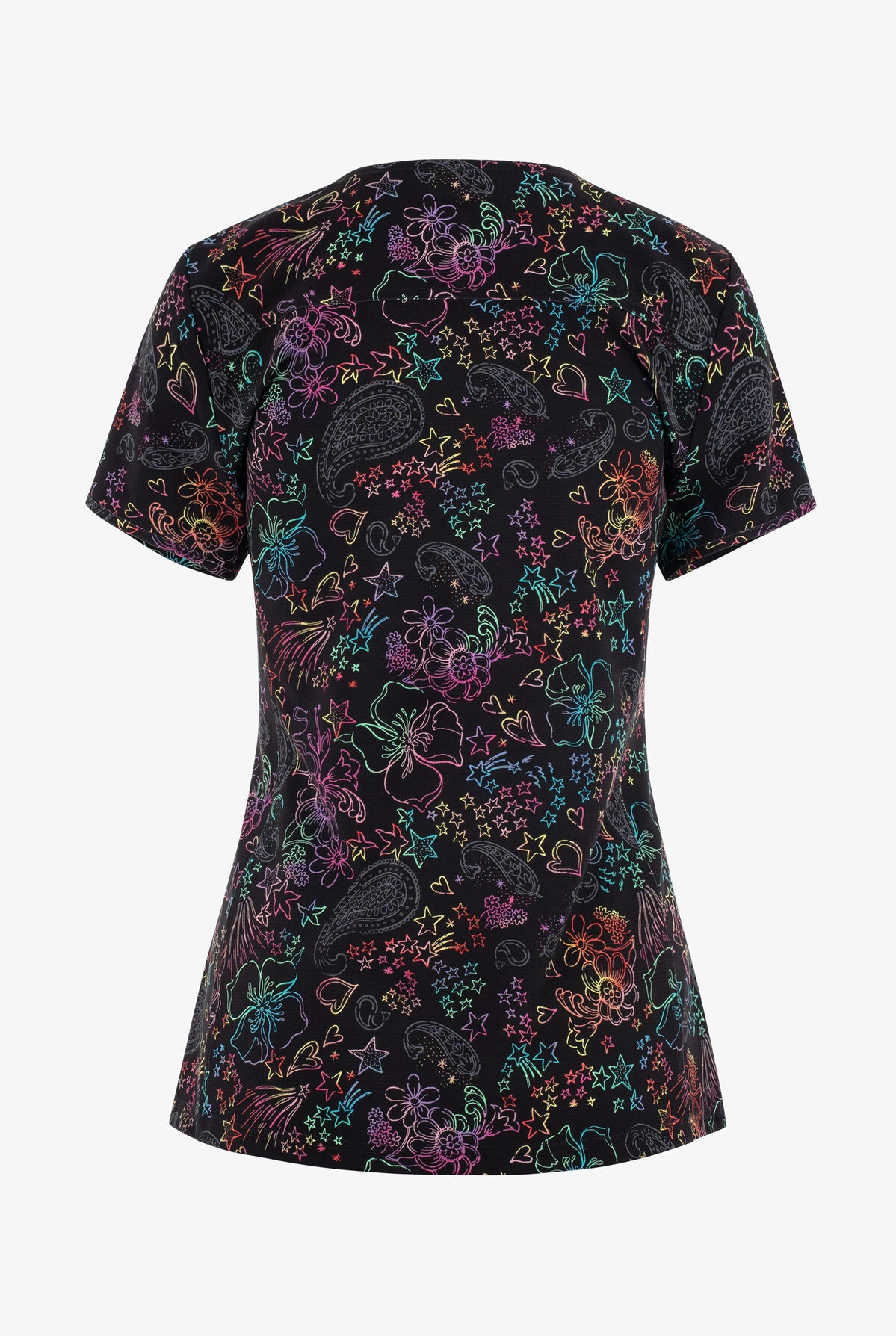 - Colorful flowers, stars and paisleys on a black background