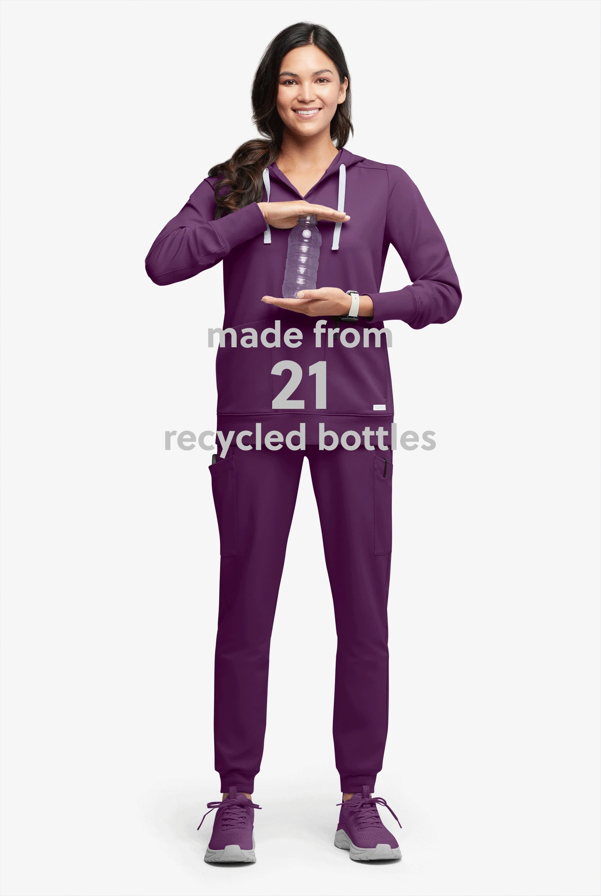 Who doesnโt love a hoodie? So comfortable โ and it keeps chills off your head and neck. Here, rib-knit cuffs and bottom add extra softness. Every style in our Resurge collection is thoughtfully designed and responsibly sourced. Made of 100% recycled polyester (the most of any scrubs brand!), plus recycled trims and zippers. Even the bag it comes in is recycled. Long story short Resurge lets you feel good and do good.