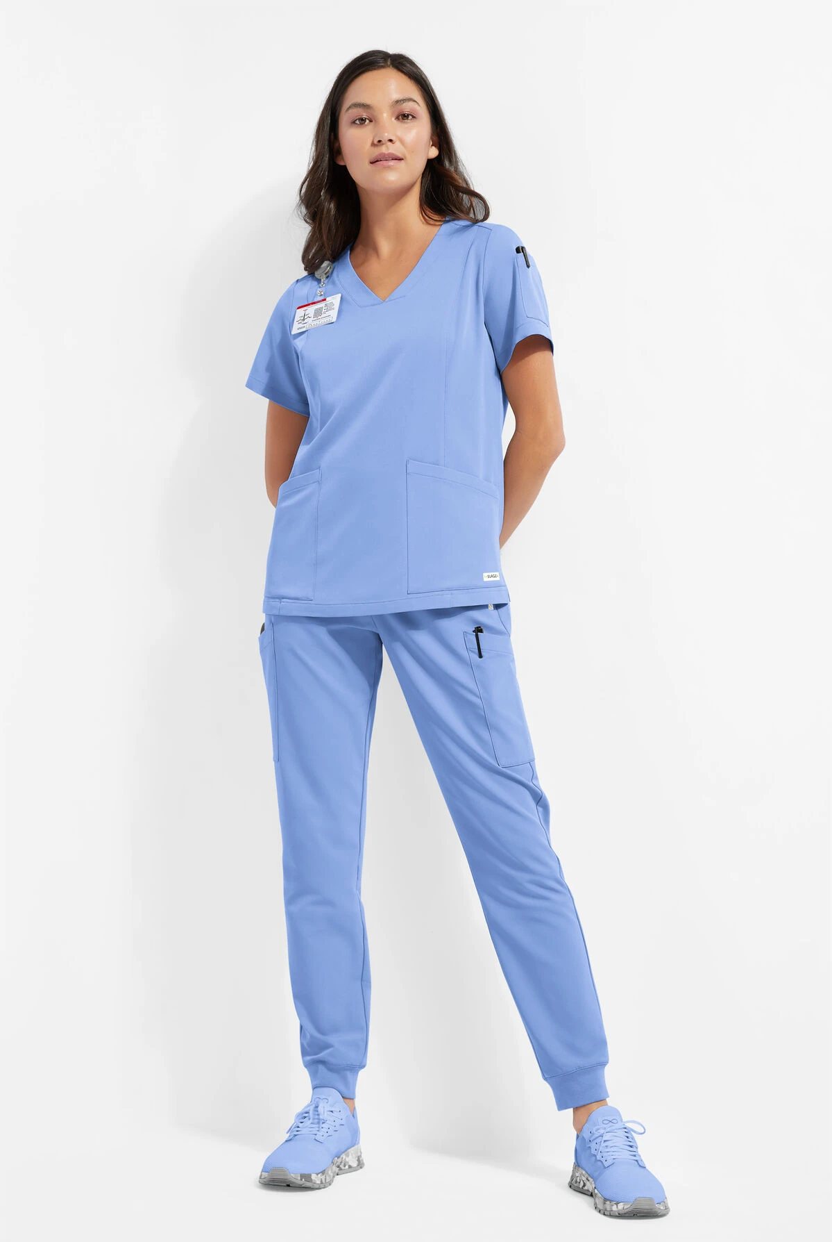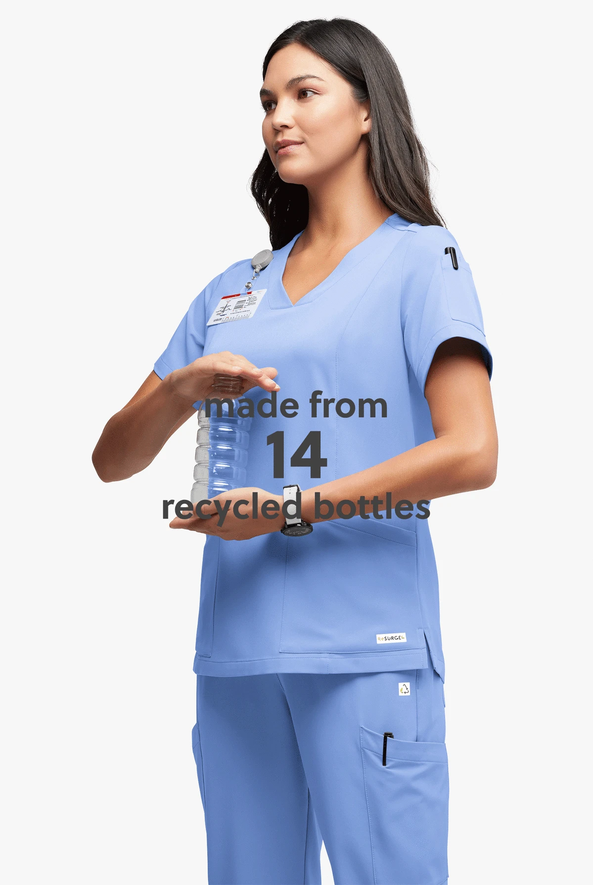 Ruby women’s 5-pocket v-neck scrub top features a modern fit with feminine curved v-neck and side vents for ease of movement. It has flattering princess seams on front and back for a better fit and an id loop on wearers right shoulder. Every style in our Resurge collection is thoughtfully designed and responsibly sourced. Made of 100% recycled polyester (the most of any scrubs brand!), plus recycled trims and zippers. Even the bag it comes in is recycled. Long story short Resurge lets you feel good and do good.