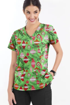 Butter-Soft Christmas Baubles Grass Green Women’s 2-Pocket Keyhole V Neck Printed Scrub Top
