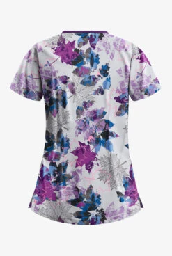Butter-Soft Autumn Park Silver Women’s 3-Pocket Criss Cross Print Scrub Top