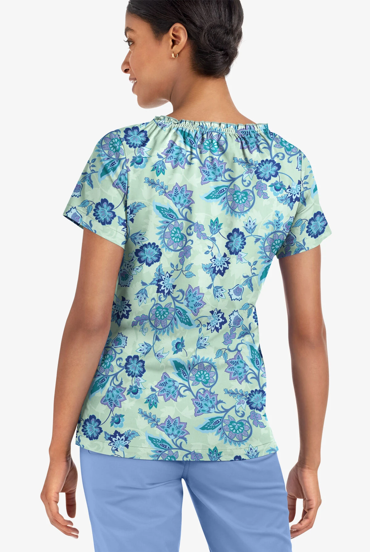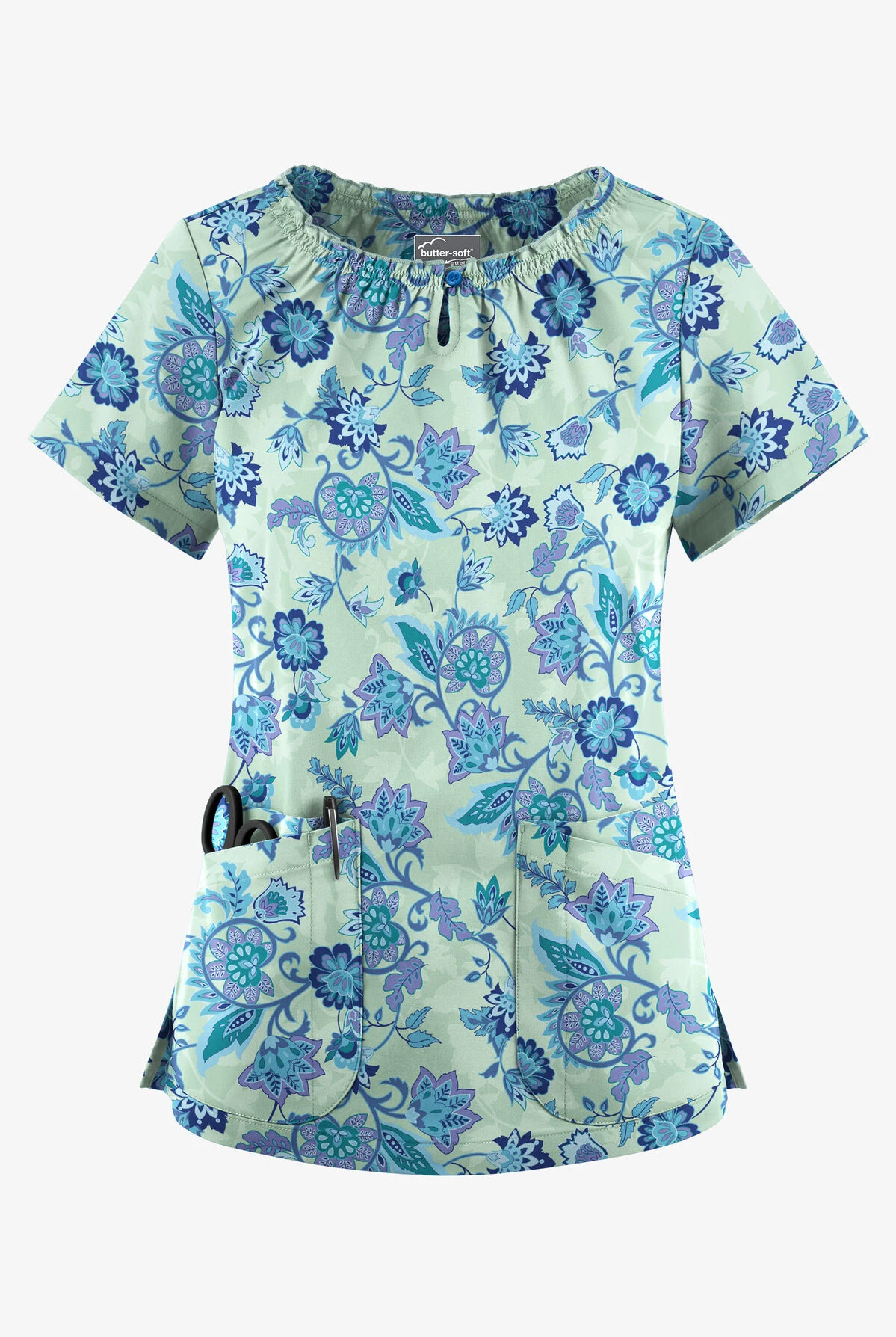 So feminine! From its graceful, gathered neckline to its easy-moving side vents, this peasant scrub top combines fashion and function in one pretty style. 6 pockets give you plenty of storage too. Each piece in our Butter-soft Stretch collection was designed for 12+ hour shifts, and made from easy-care, 2-way stretch comfort fabric.